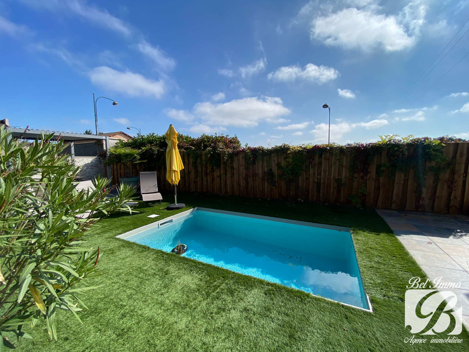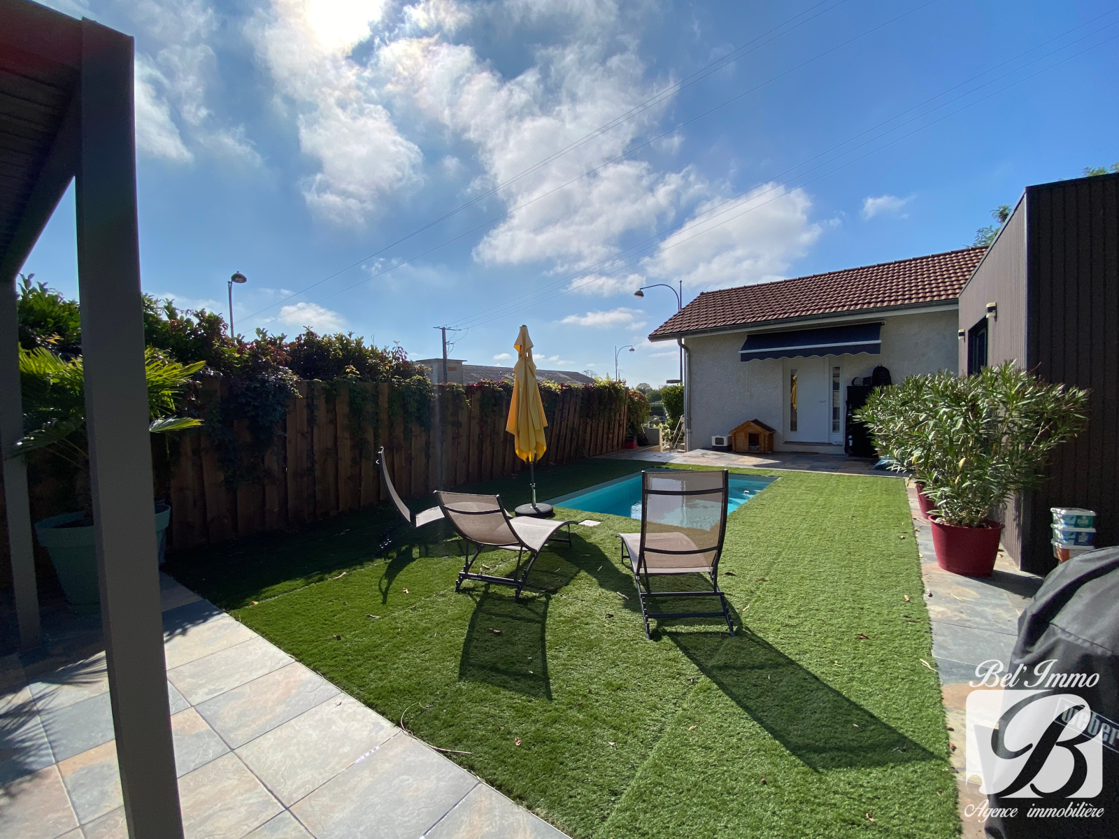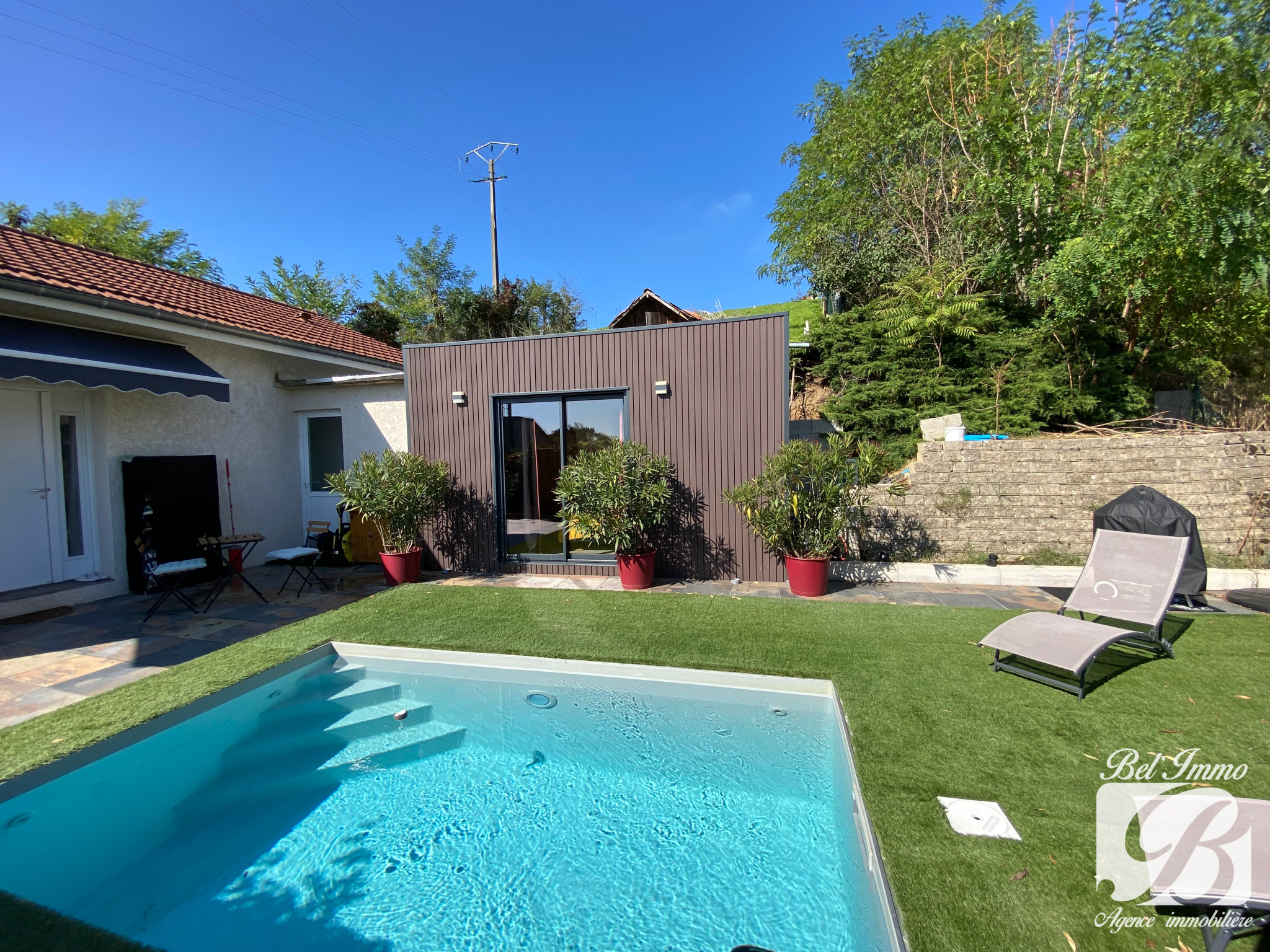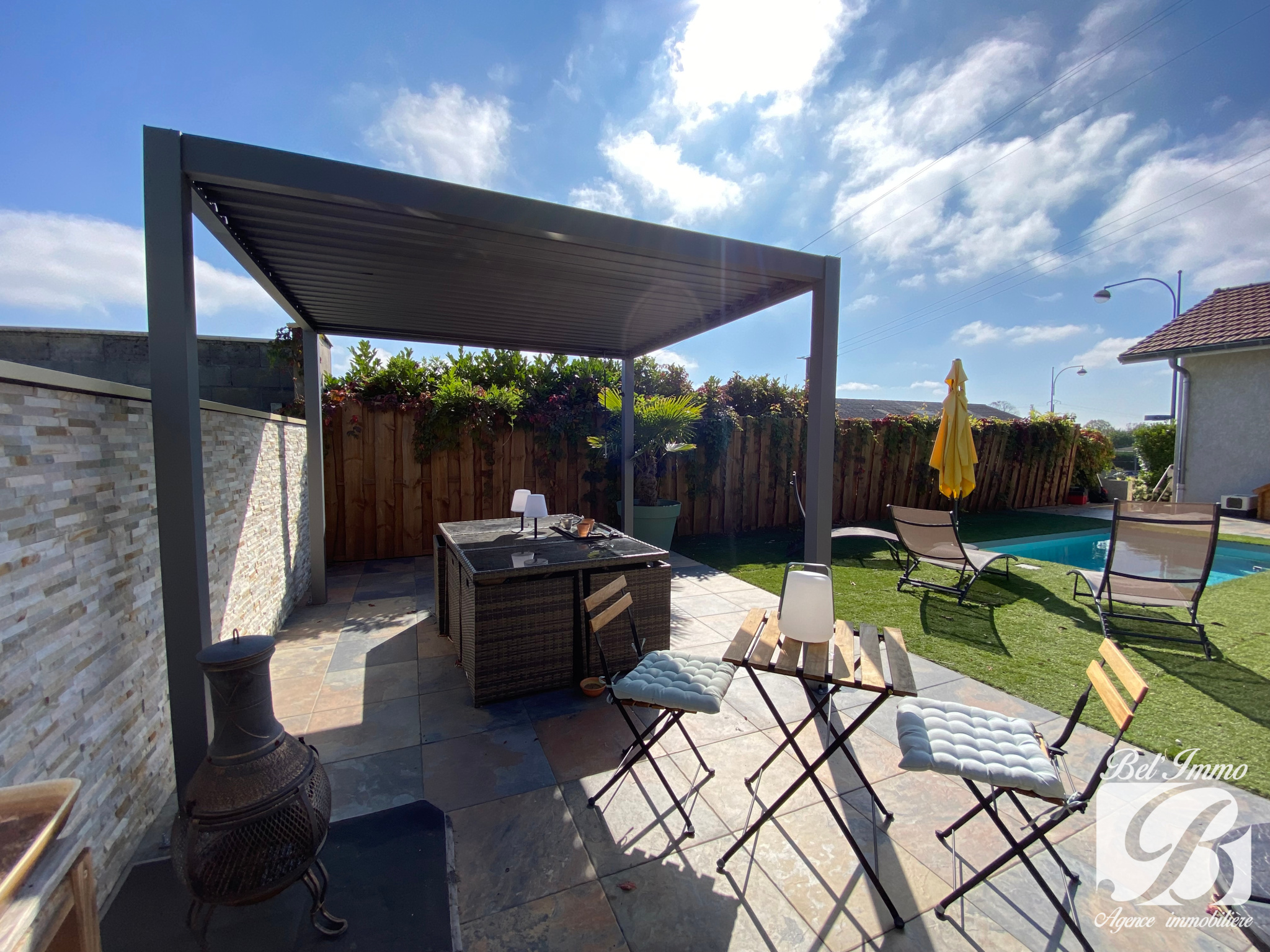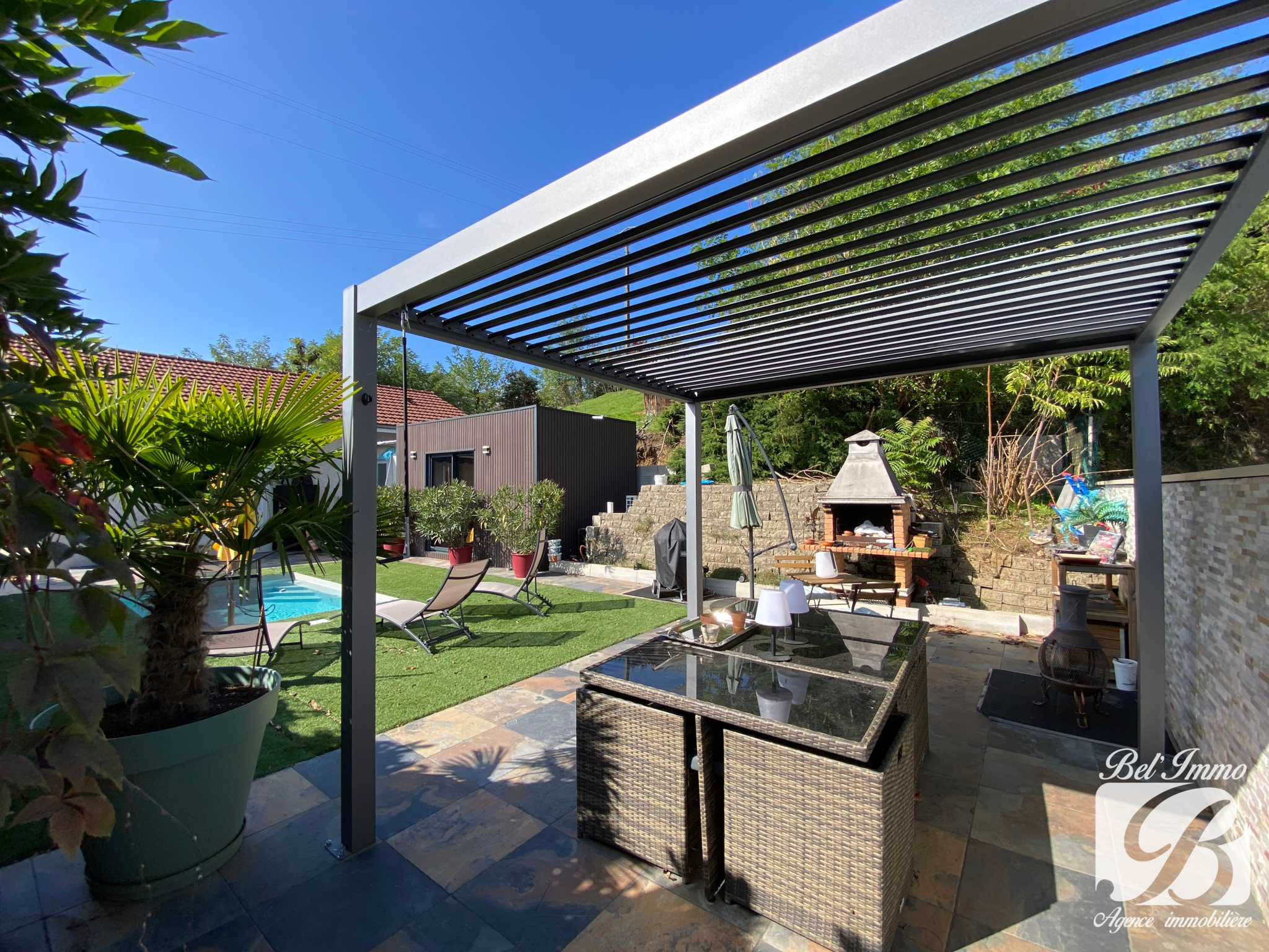 L'extérieur est bien optimisé : un coin terrasse avec pergola bioclimatique et barbecue, et un espace piscine.