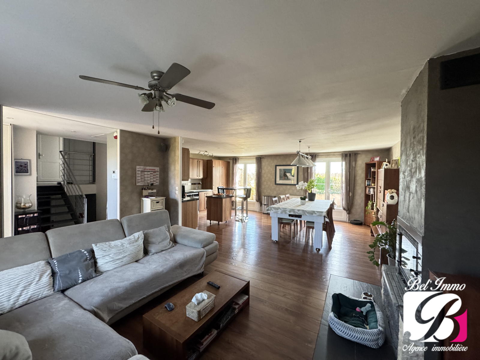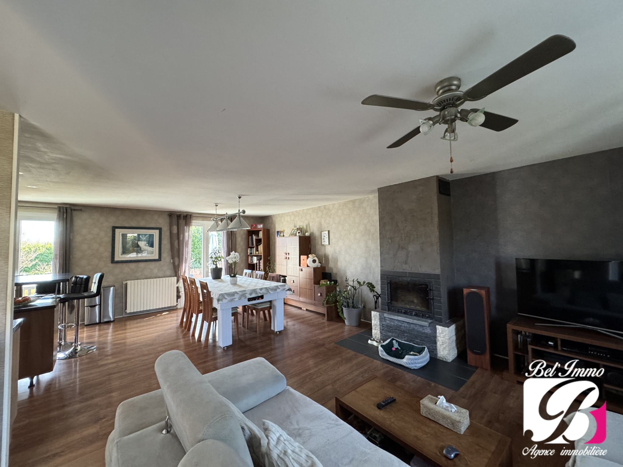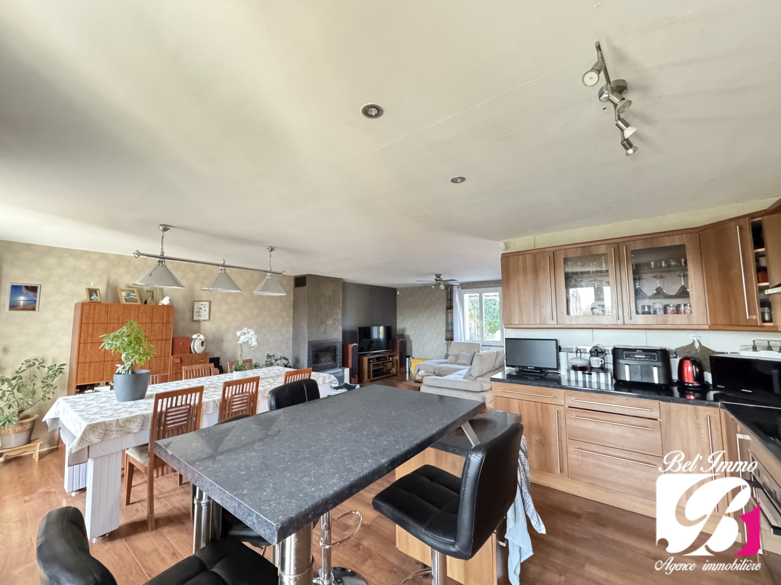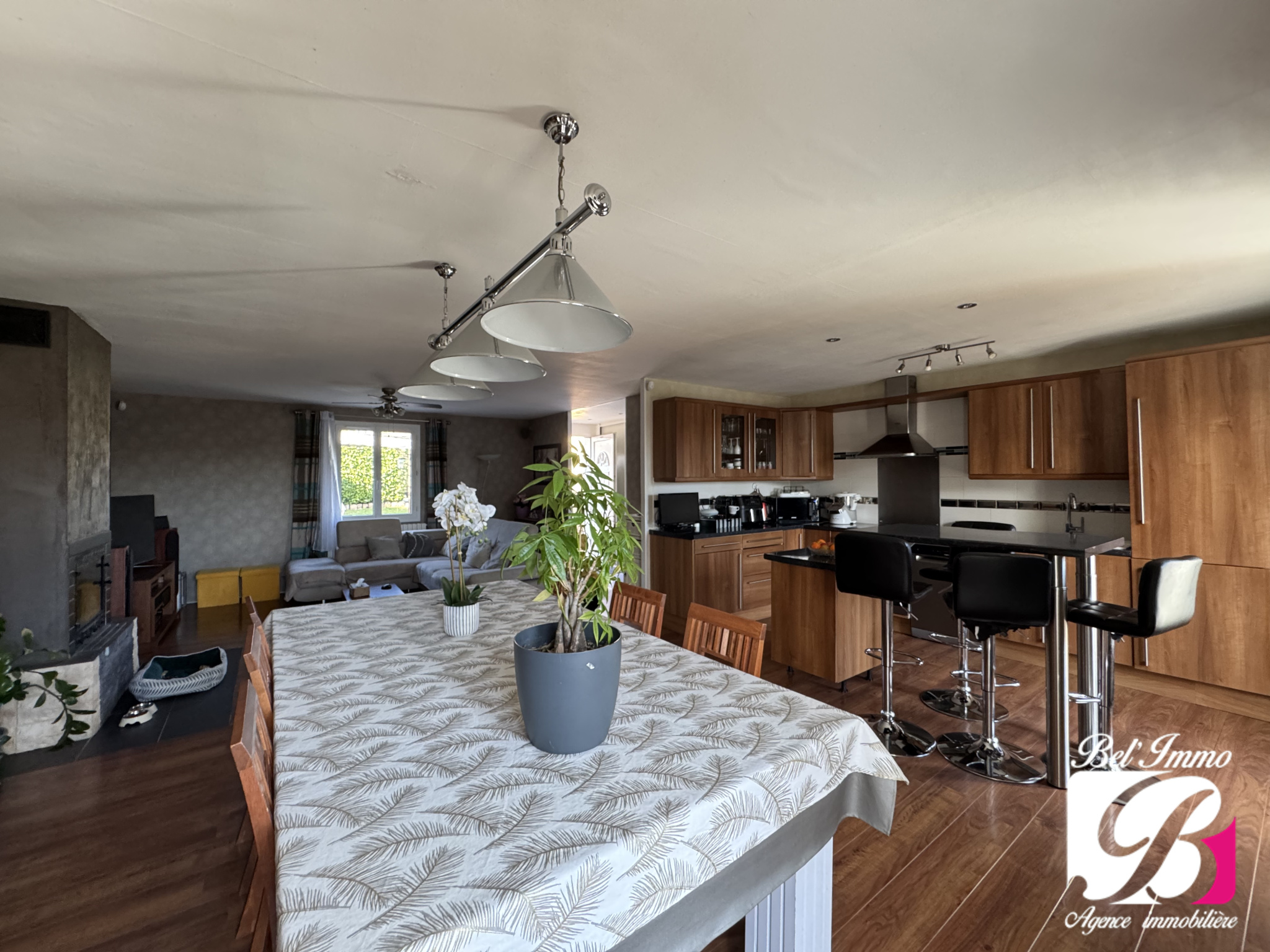Maison d'environ 129 m², comprenant un hall d'entrée, une belle pièce de vie traversante agrémentée d'une cuisine équipée et meublée.