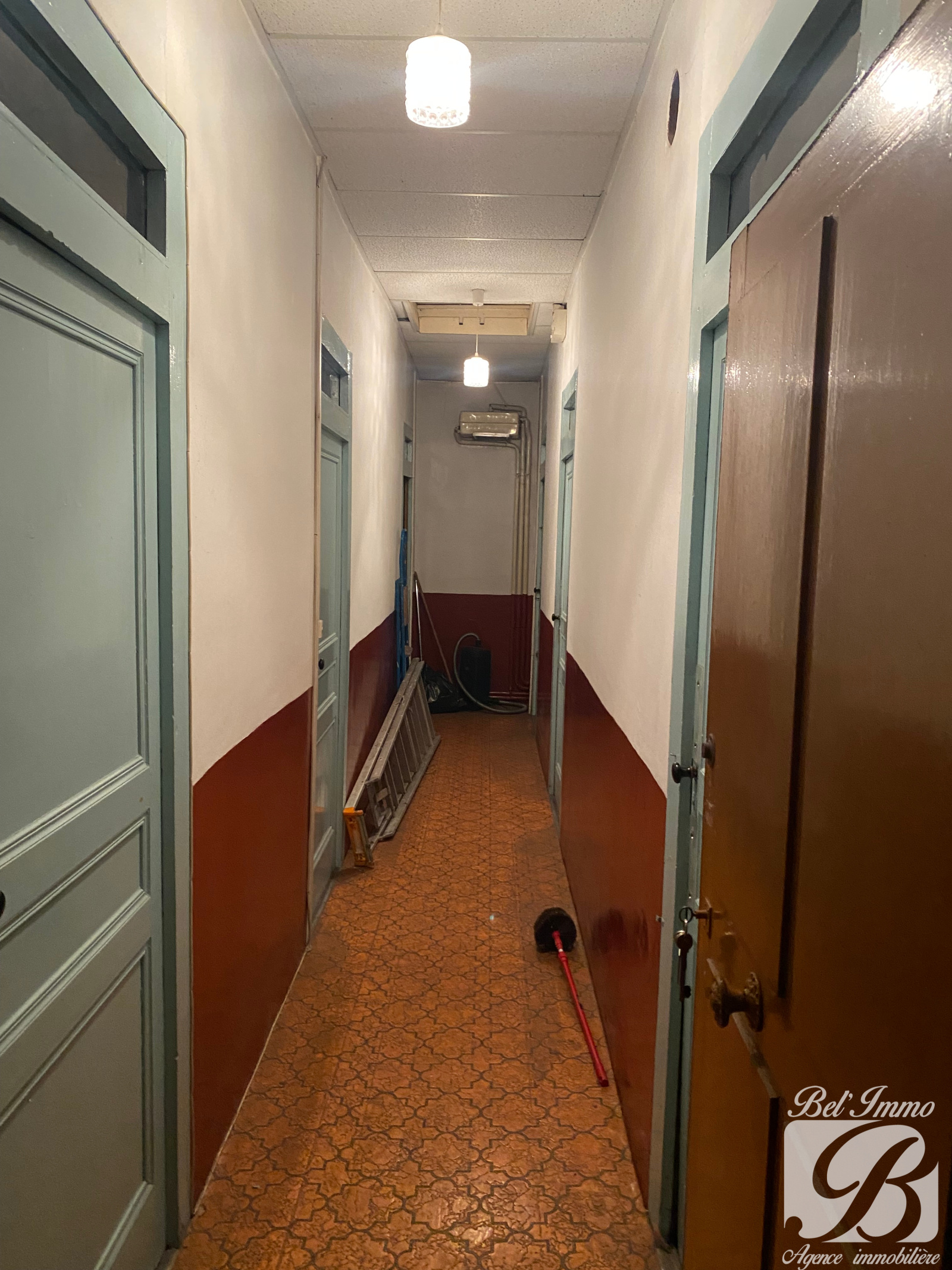 A l'étage, au-dessus du commerce, un long dégagement dessert 6 pièces pour une surface de 80.36 m².