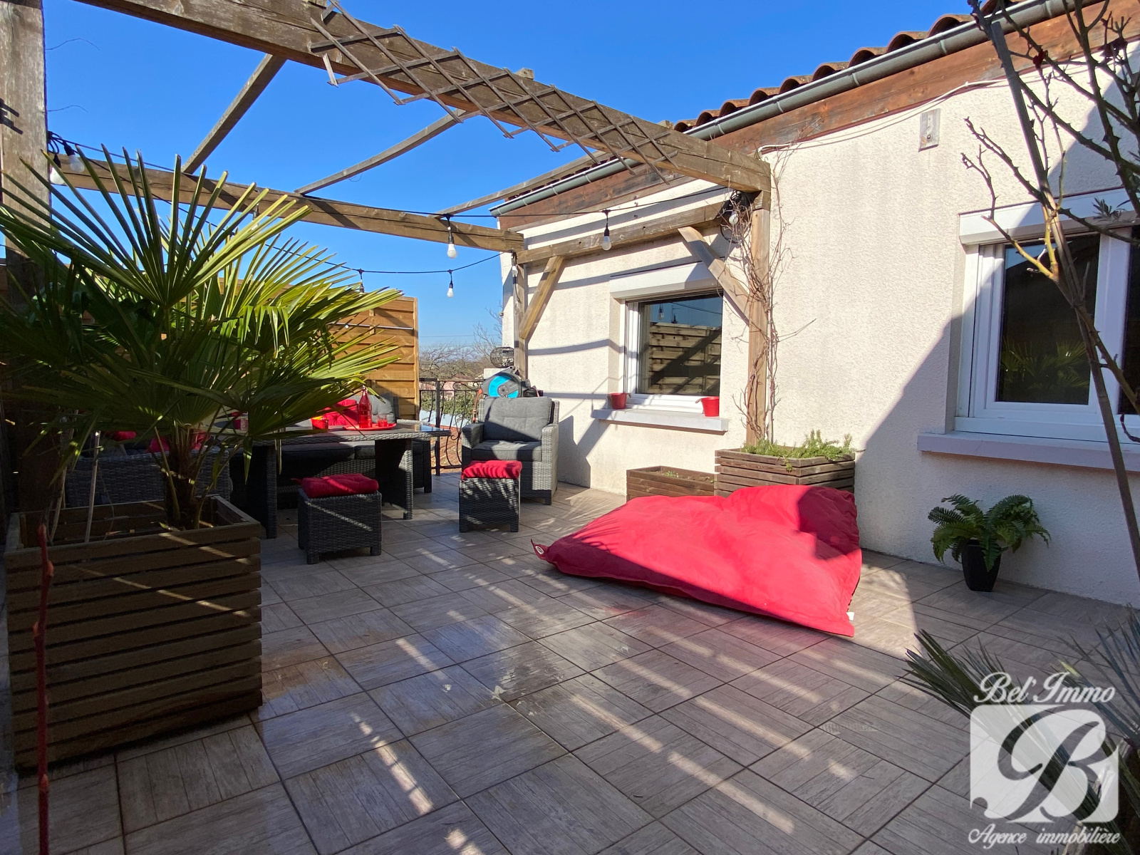 Côté extérieur, une spacieuse terrasse avec pergola en bois vient agrémenter ce bien.