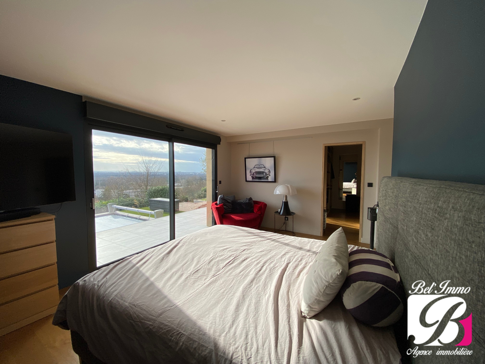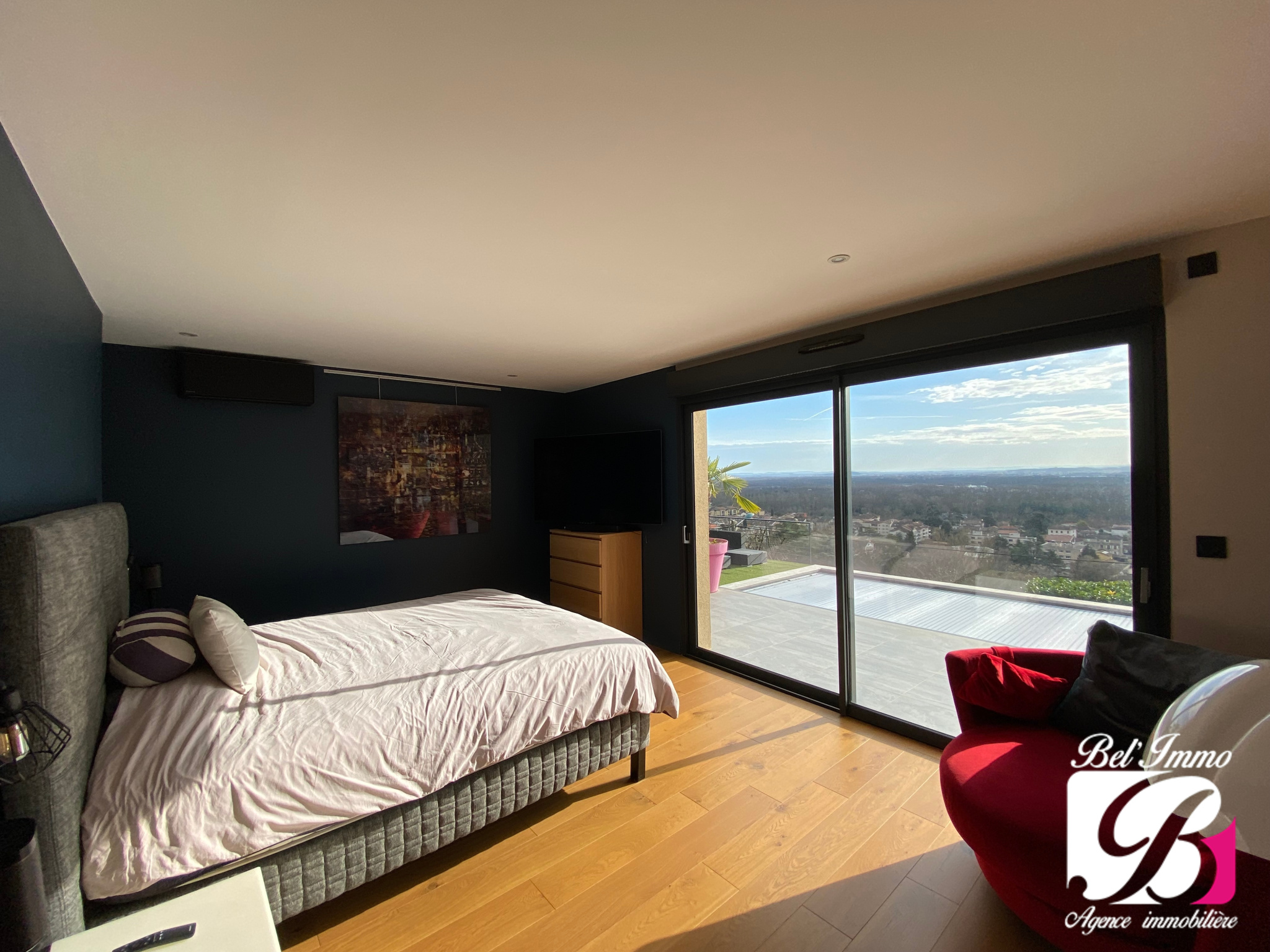 La chambre parentale, aux prestations soignées, dispose de son dressing et de sa salle de douche, créant un véritable espace privée avec vue sur la piscine.