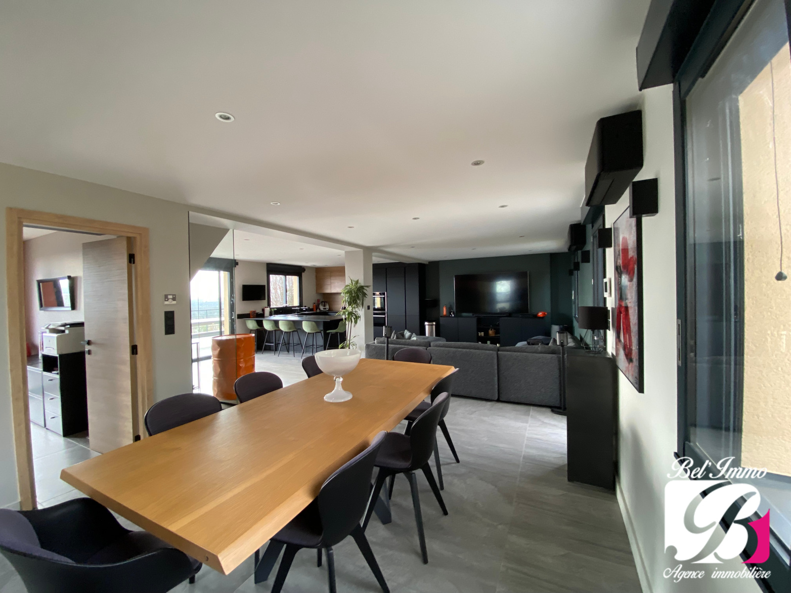 un vaste salon et salle à manger sont prolongés par une très belle cuisine équipée et meublée, un bureau, et un wc.