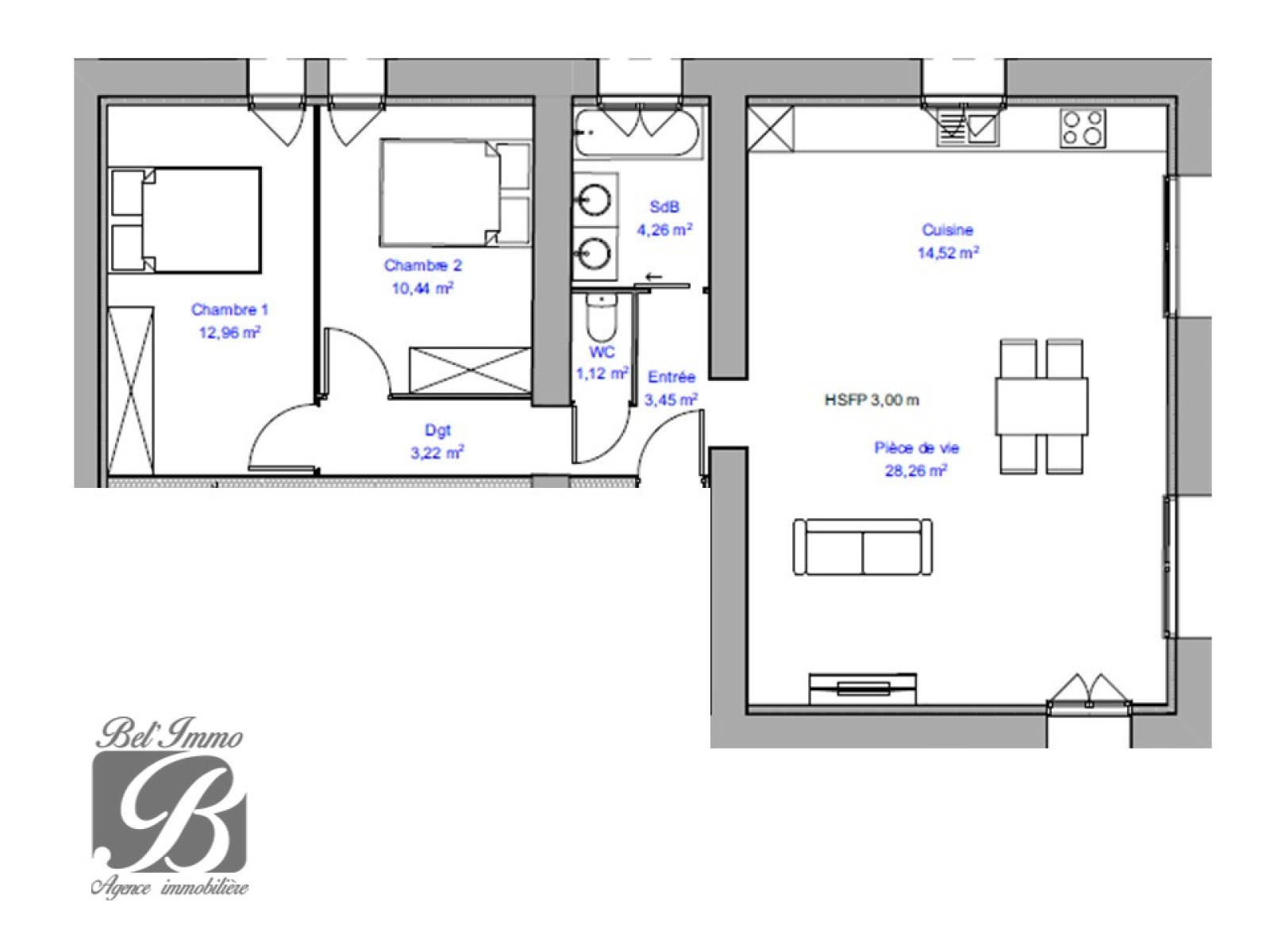 Il est composé d'une entrée desservant une salle de bain, un wc, 2 chambres, une grande pièce de vie d'environ 42m² triple exposition, très lumineuse.