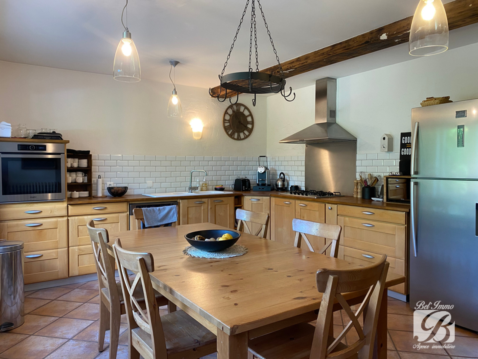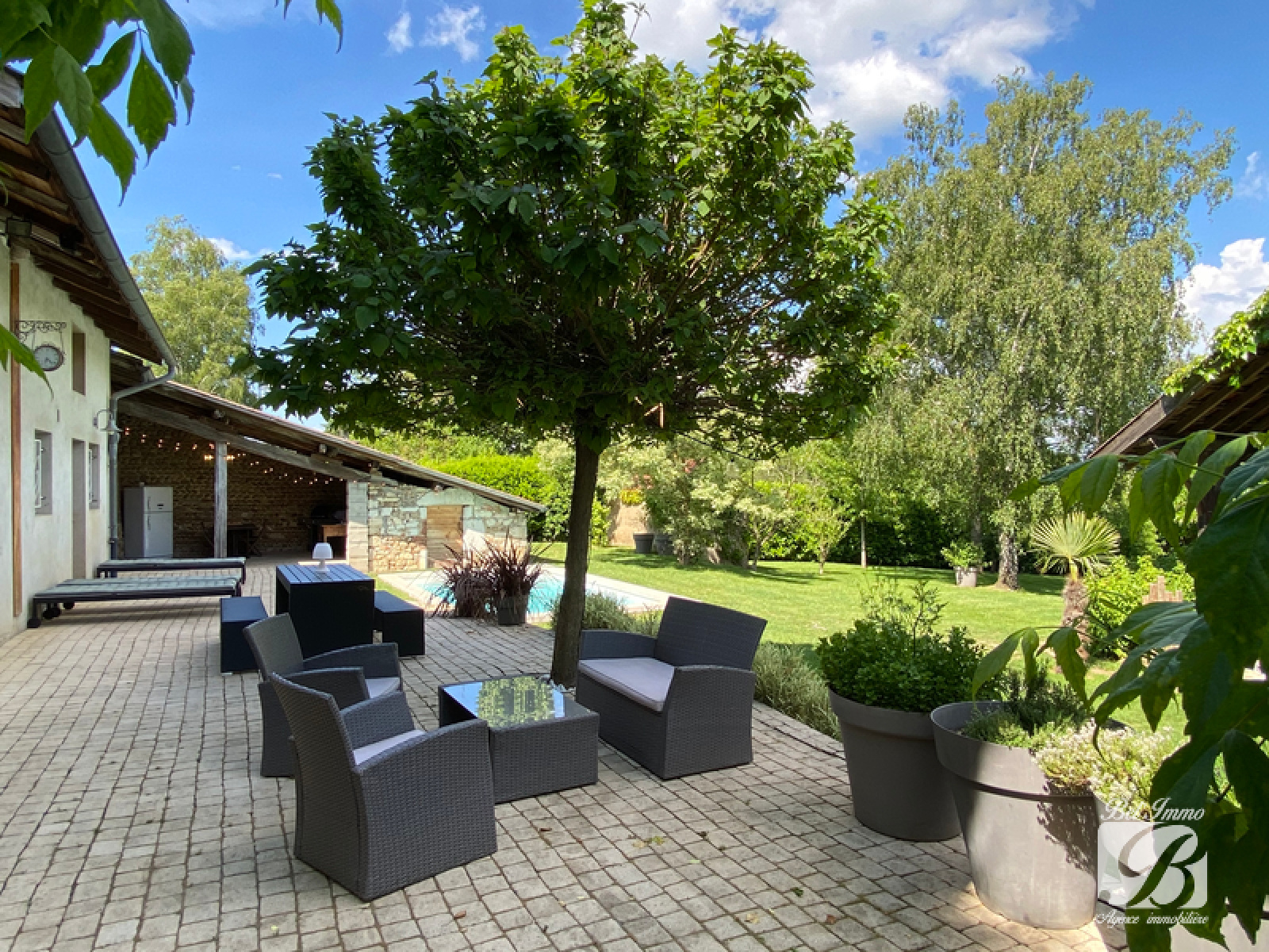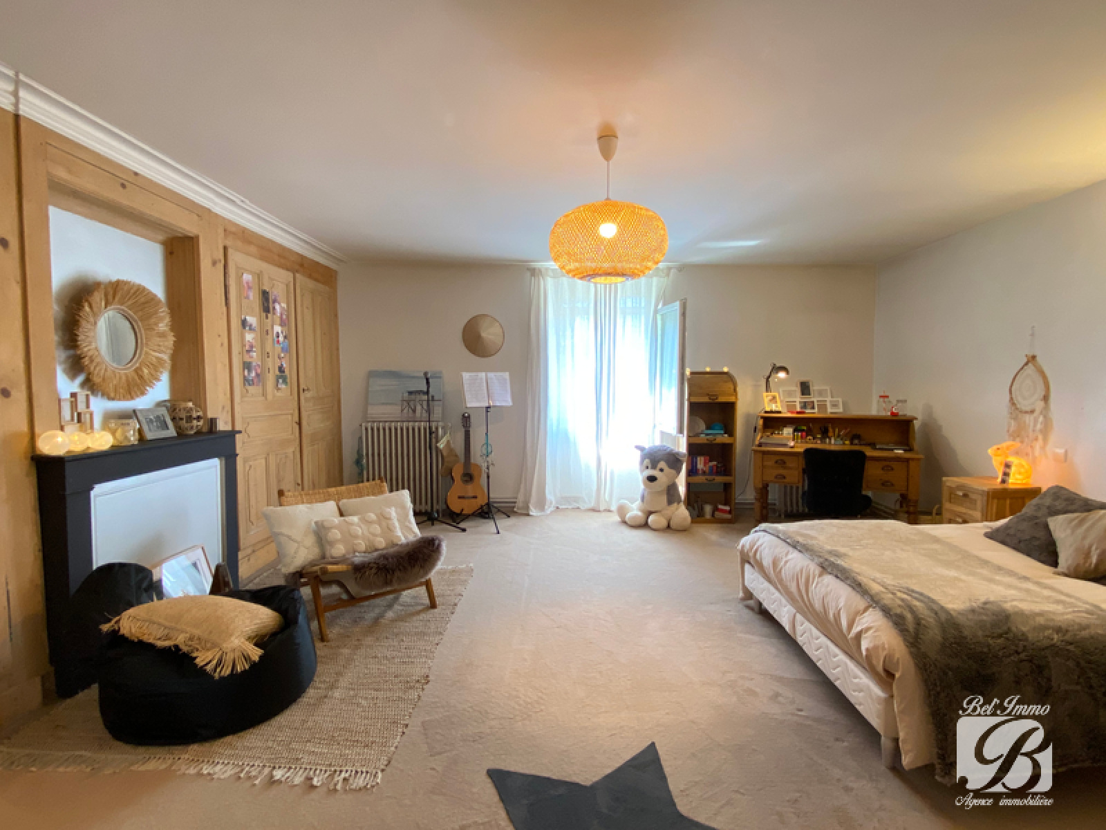 Aux alentours d'Ambérieu en bugey, maison atypique avec beaucoup de charme composée au RDC d'une grande entrée avec de nombreux placards muraux, un salon avec insert de 25m2, un grand salon/séjour de 33m2, une cuisine meublée donnant sur la terrasse, une salle de douche, un wc, une buanderie/chaufferie de 19m2 avec accès au combles aménageables. Au 1er étage, un pallier desservant deux belles chambres de 29m2 et 16m2 environ, une charmante salle de douche et un wc. Nichées sous les toits une très belle suite parentale avec dressing de 43m2 environ au sol + une 4ème chambre de 20m2 au sol. Dans un cadre bucolique vous trouverez une spacieuse terrasse pavée en partie abritée, plongeant sur la piscine chauffée. Cette parcelle paysagée de 1889m2 entièrement close et sans vis à vis est agrémentée d'une dépendance attenante de 40m2 à réhabiliter avec son entrée indépendante. D'un grand atelier de 63m2 au sol environ sur 2 niveaux, un abris bois de 40m2 environ, un local technique et d'anciennes loges à cochon. Un carport 3 voitures vient compléter ce bien. Propriété avec de très belles prestations et aménagée avec beaucoup de goût.